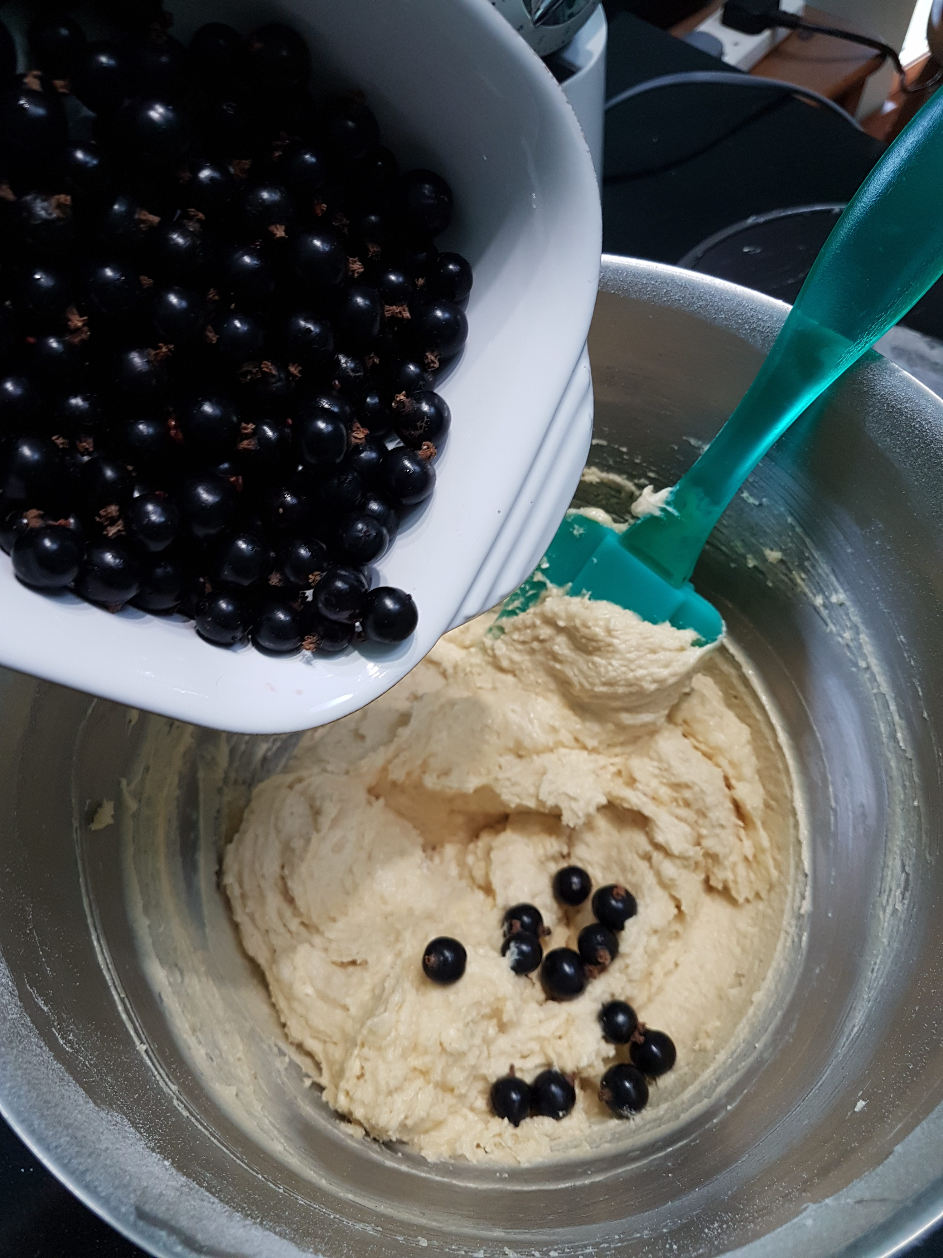 Once mixed together fold in the blackcurrants very gently until evenly spread